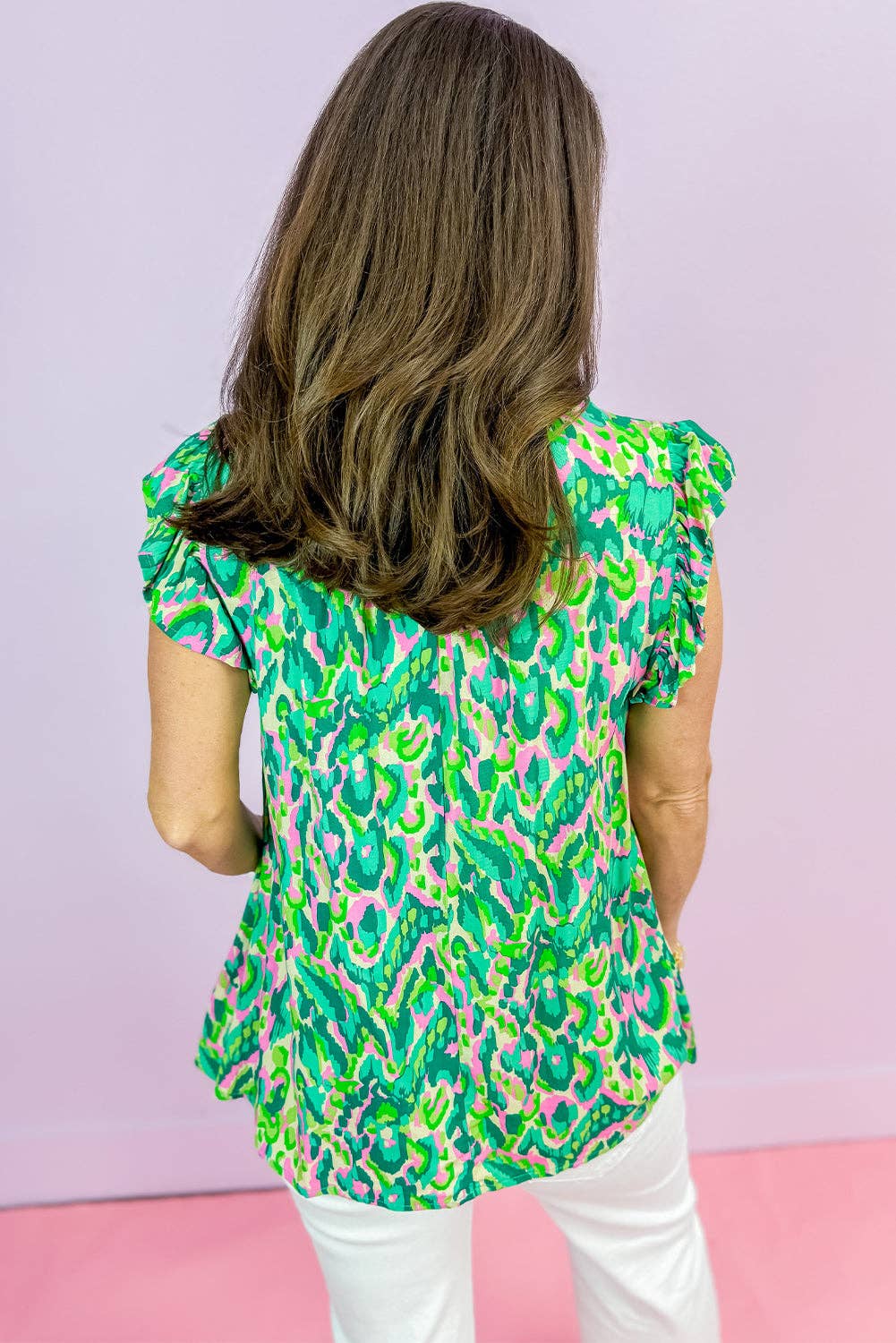 This lightweight tank top features a chic allover pattern that’s sure to turn heads. The frilled split neckline adds the perfect balance of soft and sexy, while ruffled shoulder details bring an extra touch of femininity. Easy, breathable, and effortlessly cute — this is a must-have for summer styling.