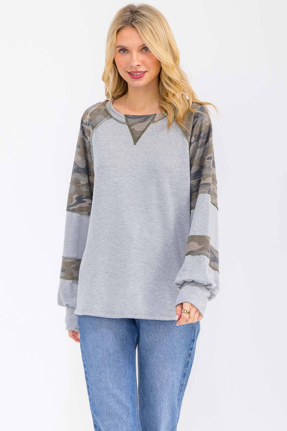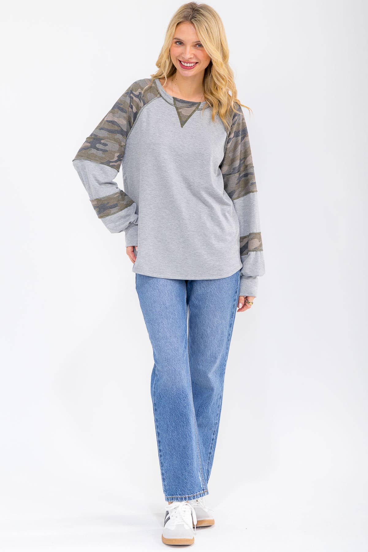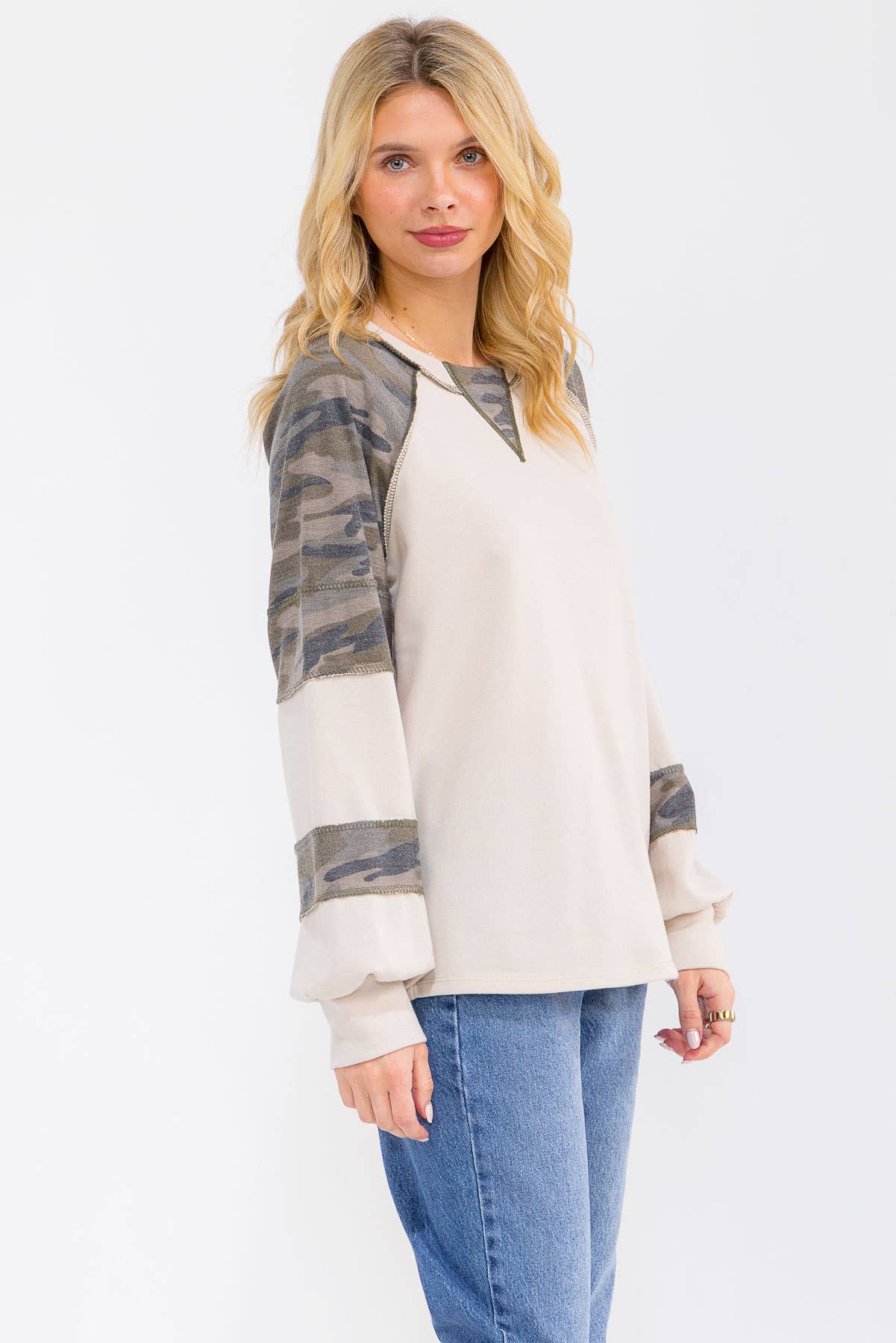 This camo contrast raglan top features a soft neutral body paired with camo print accents along the shoulders and sleeves for an effortlessly cool look. Exposed seam details and a camo-trimmed V-stitch neckline add just the right amount of character, making this an easy everyday piece with a little attitude.